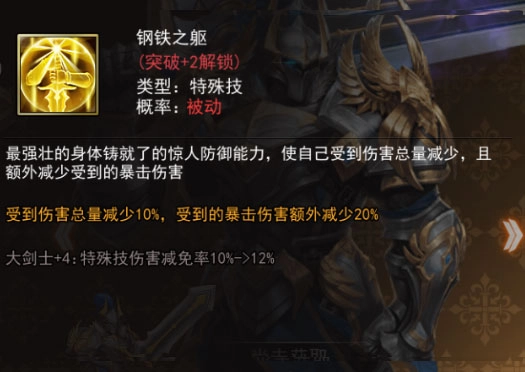 特殊技:凭借最强壮的身体所铸就的惊人防御能力,受到的伤害总量会有所减少,且受到的暴击伤害还会额外降低一定数额。