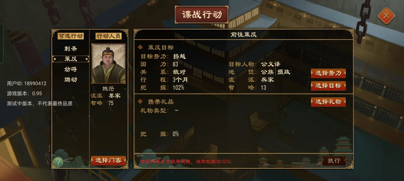小贴士:谍战外交的成功率与派出的门客流派及智略相关,刺杀和策反的成功率除了和己方派出的门客有关外,还与目标对象的流派和智略存在关联。墨家在谍战方面最为擅长,同时也是最难被刺杀或策反的流派。