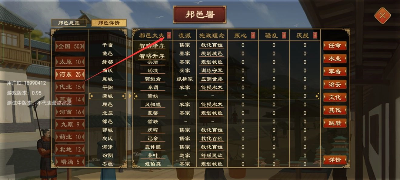 邦邑署是用于查看全国各地都邑大夫与城邑信息的场所。在这里,能够一键任用大夫;借助判心、骚乱、厌战相关的柱状图,可掌握各地详情并开展一键操作;同时,也能进入详情页面,针对单座城邑单独进行任命。