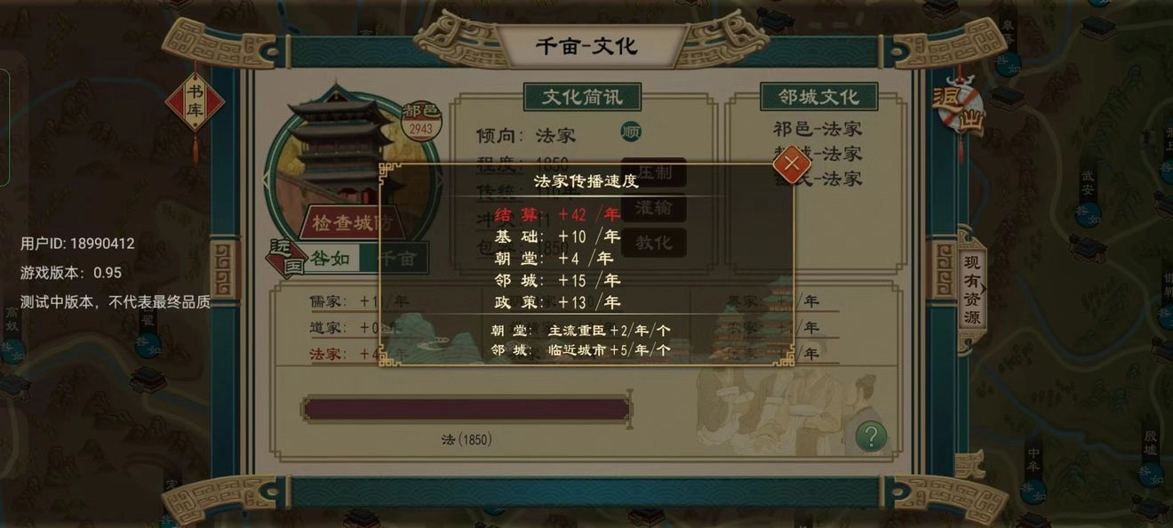 城邑文化的构成要素为文化传播速度与文化量。当城邑内主流文化量超过其他所有文化量之和时,该城邑文化处于顺流状态。若要提升文化量,关键在于加快文化传播速度,具体可通过以下途径实现:任用属于主流文化流派的朝臣、推行特定政策、在城邑内放置书籍、参与并取胜学宫辩论,以及消耗正统进行文化灌输。在提升自身传播速度的同时,还需压制其他流派的文化传播速度——若我方每年的文化传播速度低于其他流派总和,将始终无法完成文化转化。此外,可通过消耗正统压制文化、消耗粮草教化以提升文化量上限。需注意的是,城邑周边每存在一座其他流派的城邑,该流派文化便会增加5点传播速度,尤其到后期城邑数量增多时,文化转化过程会十分漫长。此时选择儒家流派进行文化转化效率更高,因其本身传播速度较快,且学宫辩论多围绕儒家内容展开,更易在辩论中获胜。