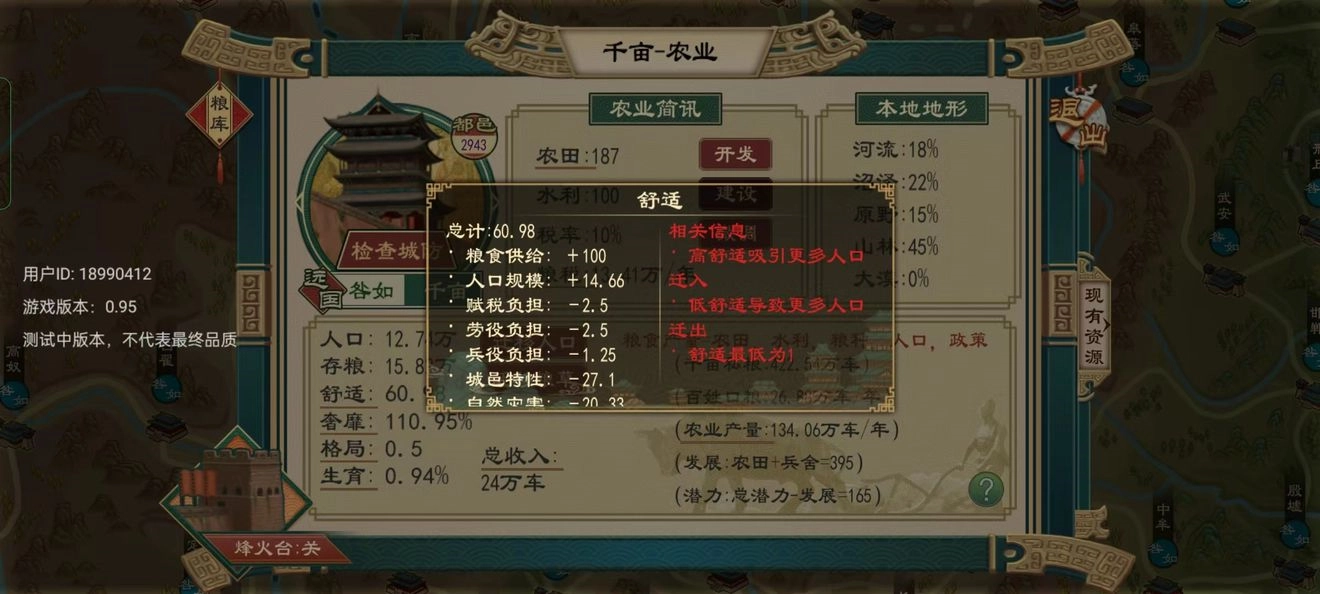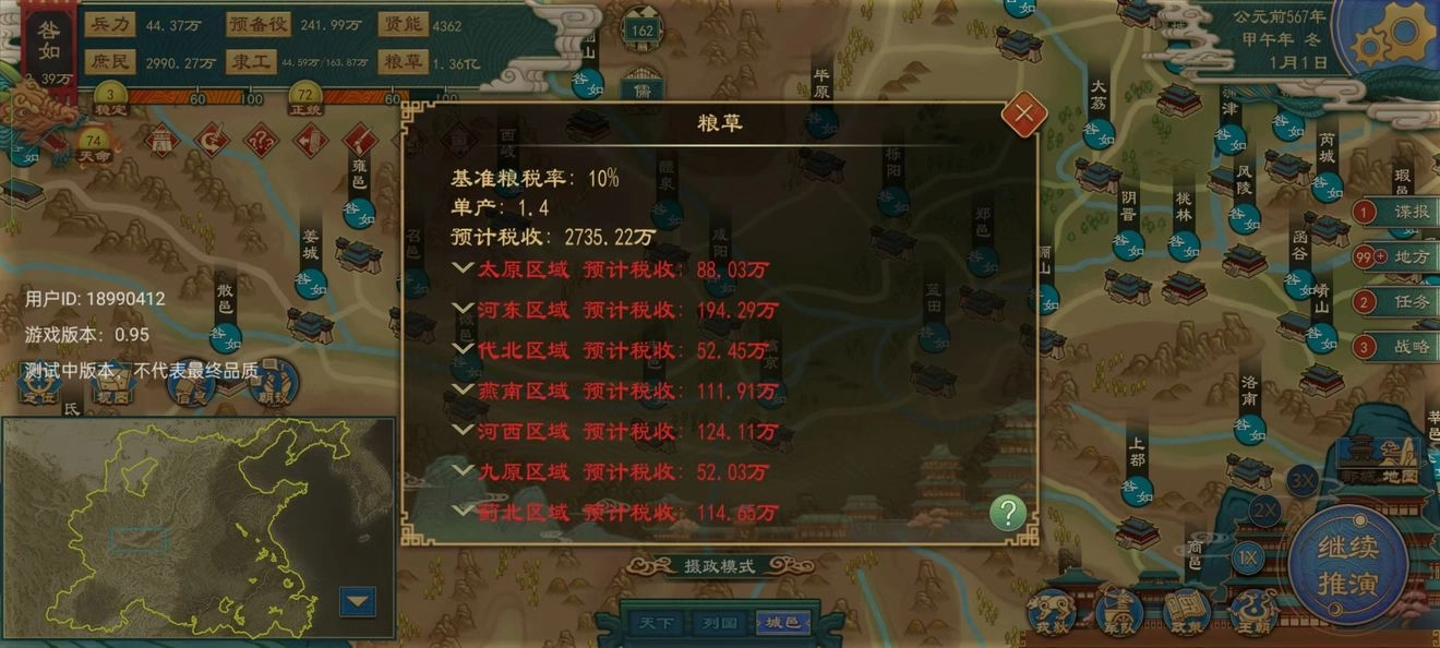 要记得每年都得推进农田开发,还要招募人才并任命大夫。等粮草的收入不仅能覆盖月初财政报表上的总额,还能有一倍以上的盈余时,我们就可以适当调低税率;等彻底实现自给自足了,就能把税率降到最低。