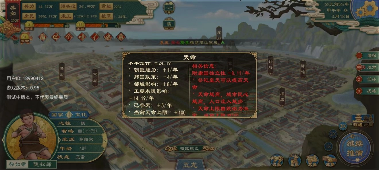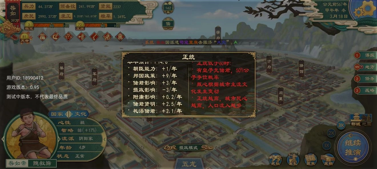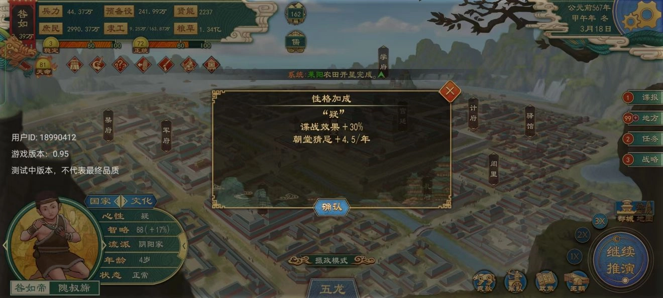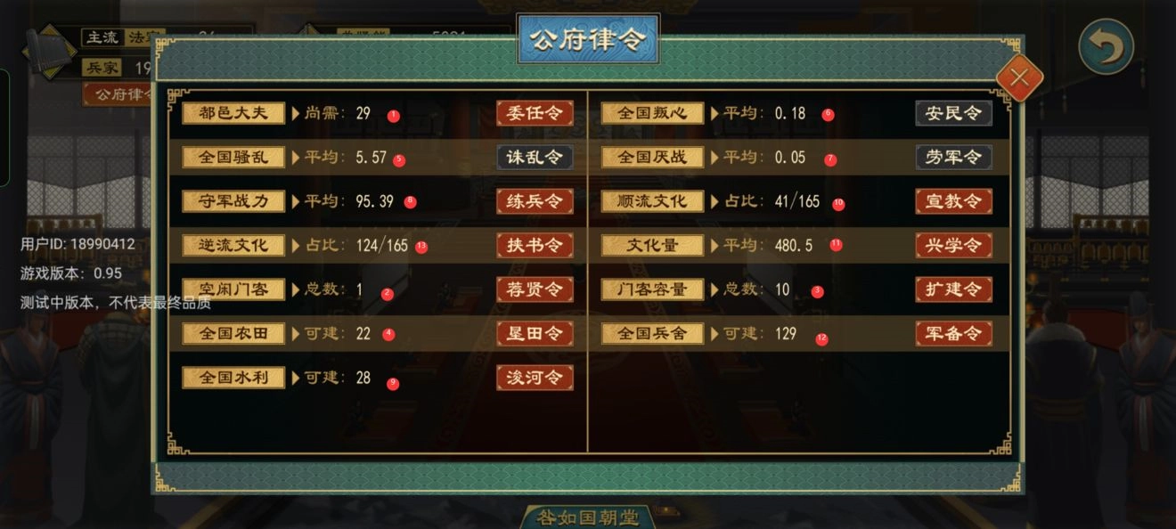 政策:实行政策和选择国家流派,君上可以根据自己的玩法来选择合适的流派,夏酱推荐新手可以尝试一下,儒家,农家,道家,上手后可以玩法家,兵家,想搞谍战等特殊玩法可以玩,墨家,道家。