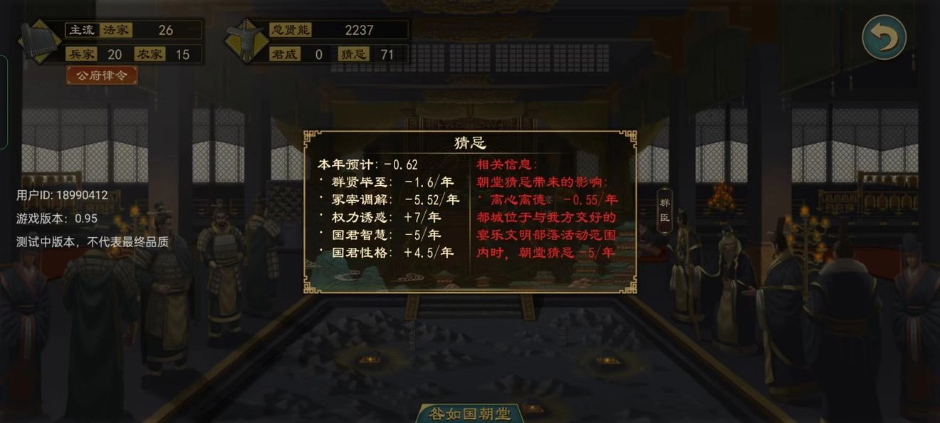 不设立储君、朝堂流派杂乱(超过三种)、处罚功勋卓著的朝臣、频繁更换朝臣等行为,都会提升猜忌度;而降低猜忌度,则能有效增强国家稳定度与君主权威。