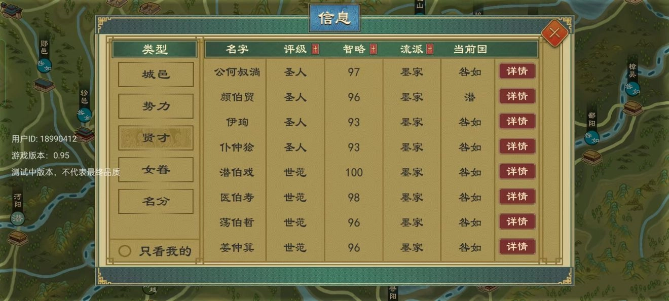 详情列表里带加号的选项,都支持按高低排序检索,方便我们依据实际情况任免大夫。比如判心值高的,可用纵横家来降低骚乱;处理骚乱问题时用儒家;要是出现厌战情绪,就用阴阳家应对等等。下面是小夏亲自测试总结出的所有流派具体作用。