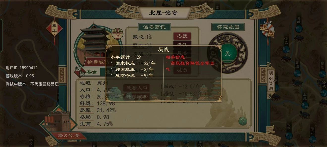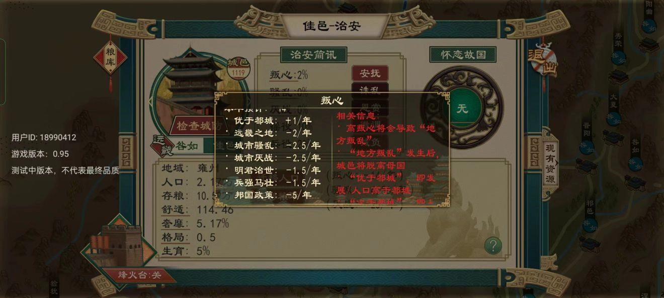 当城邑文化与主流文化存在差异时,判心便会上升;判心过高则可能引发叛乱。对此,可通过【安抚】手段降低判心,也能迁都至判心较高的城邑区域。不过,若想从根本上解决问题,仍需加快文化传播,促使城邑文化与国家主流文化趋于统一;倘若确实难以压制,还可将该城邑分封给宗室成员。