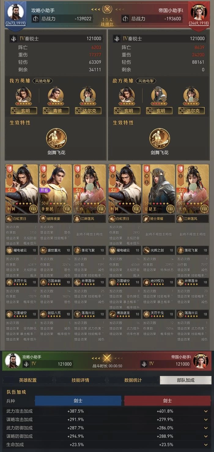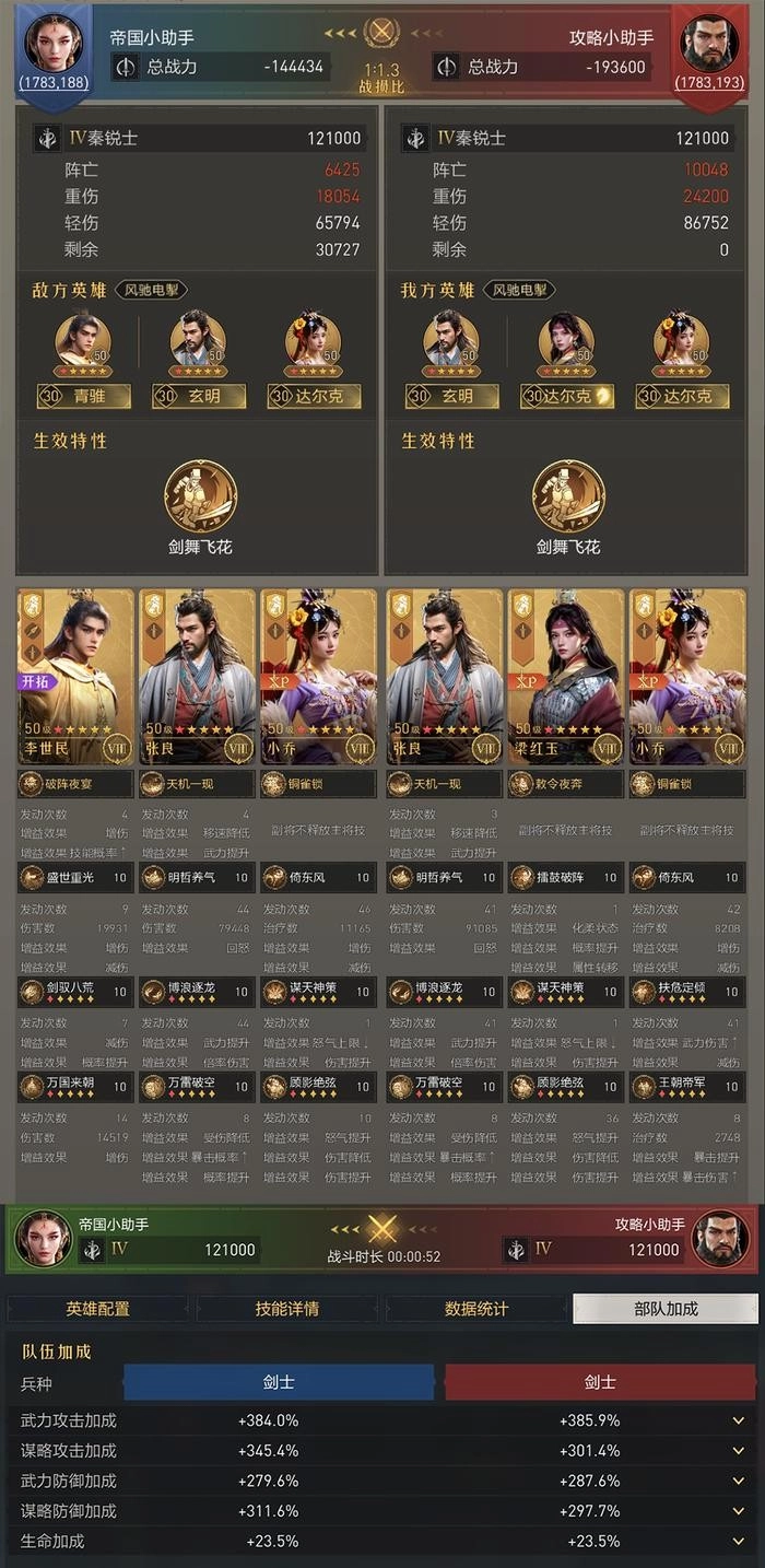 从战报中能够看出,李世民的主将技启动速度比对手稍快一些,正因为如此,张良固有技能的触发频率有了一定提高。再结合李世民自身具备的输出、减伤等作用,在没有对原张良剑的坦度造成影响的前提下,更充分地展现出了双核阵容所带来的优势。