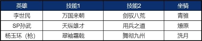 李世民的高频主动技能,能很好地和SP孙武的固有被动形成联动,再搭配上新英雄杨玉环以及翠袖霜戟,能进一步放大联动带来的收益。这套阵容在输出、坦度和回复能力上都表现不俗,而且它兼容枪兵与剑兵两种兵种配置,在实战中的适用场景也十分宽泛。