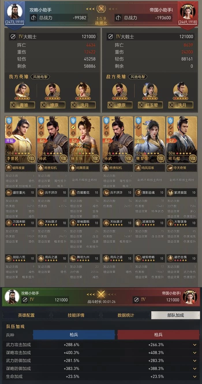 ◆ 李世民孙武枪/剑阵容:融合多种固有技能类型,搭配杨玉环后坦度表现出色,同时谋略龙息与孙武主将技具备属性压制效果,在实战中功能性良好。
