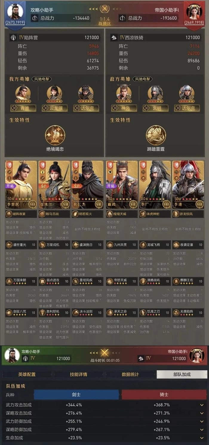 连击骑作为一套老牌的强力阵容,尽管赵云的主将技能有所削弱,但他的实用性依旧比关羽略胜一筹。
