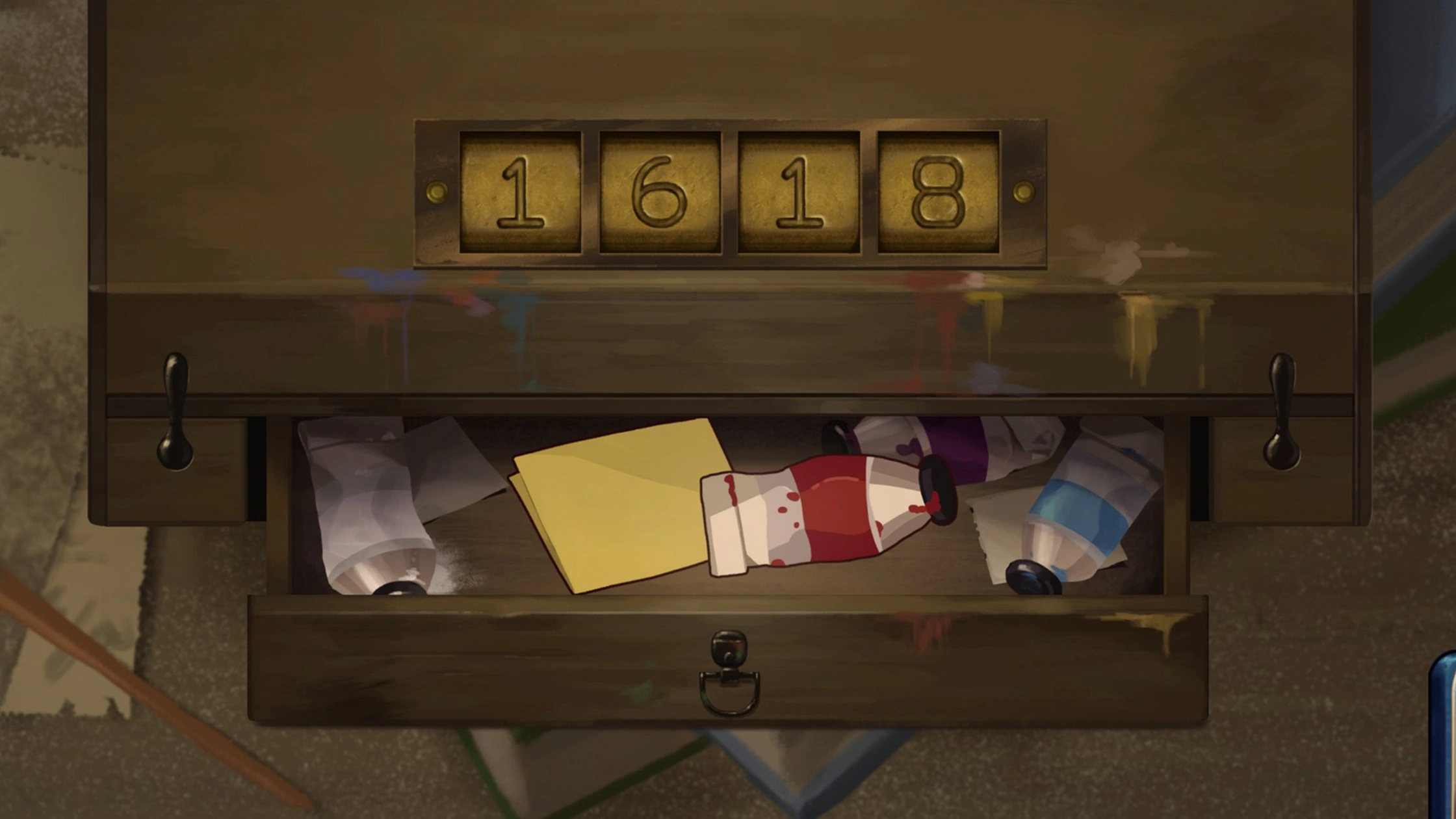 最后在小抽屉里找到蓝色颜料,把它填到画里就能通关了。
