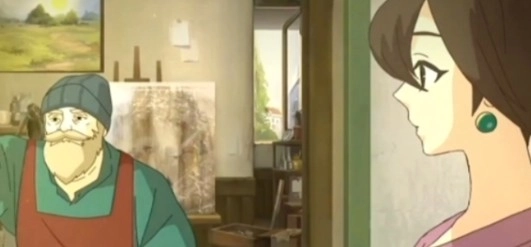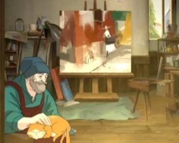 把视线转向对面的老人,见他正抚摸着小猫,随后继续完成中间的画作。