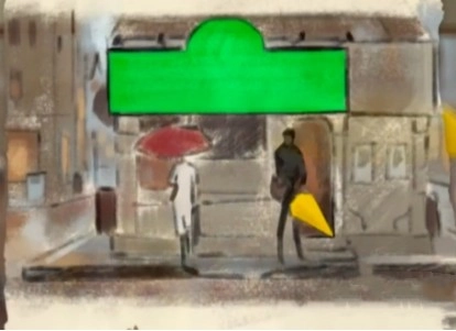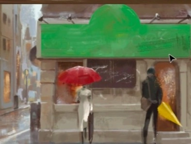 按照画作给出的提示,把女生手中的伞添上红色,男生手中的伞为黄色,上方的招牌则是绿色。