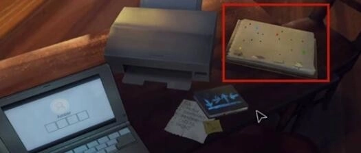收集齐这四个箭头后,点击打开电脑旁的笔记本,能看到四个颜色各异的点。按照箭头所指的方向把这些点依次连接并完成绘制,就能得到电脑的密码1618。