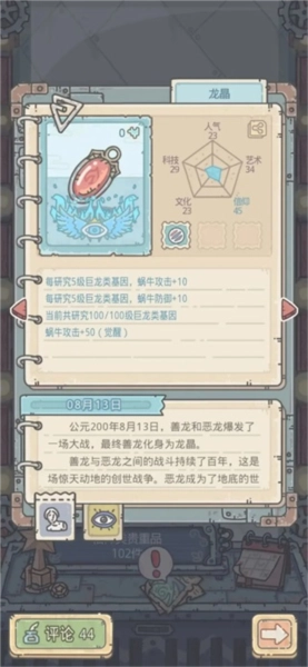 ③ 全能强化:完成研究后,可提升蜗牛的五围属性,同时增加探索过程中获得神龙宝箱的概率