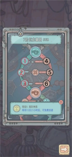 中间格是罗盘增强,总共能研究三次,每次研究会让旅行和虚拟罗盘的效果分别提升60%、80%、100%。巨龙的强大之处在于各方面加成幅度更大,而且六个形态的罗盘增强效果是对所有形态都生效的——所以强烈建议优先研究这个分路的DNA,不管是前期应对使徒,还是后期实现制霸,它都特别实用!