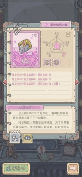 在中间格的研究中,成功获取耶梦加得之鳞碎片,累计次数为3次,每次获得的碎片数量依次是20、20和40。该贵重物品觉醒后的属性为:每当上阵的巨龙兵种部队数量达到30个时,部队防御提升28点,同时部队攻击增加56点。其技能具体如下: