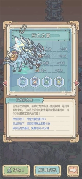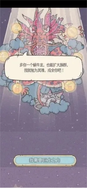 使用巨龙形态时,蜗牛的攻击、防御、追击与生命值都会获得巨额加成(该加成不会随阶数提升而产生差异),探索过程中神龙宝箱的产出数量会有所增加,此外研究巨龙类基因时还能获得一定时长的免费加速。