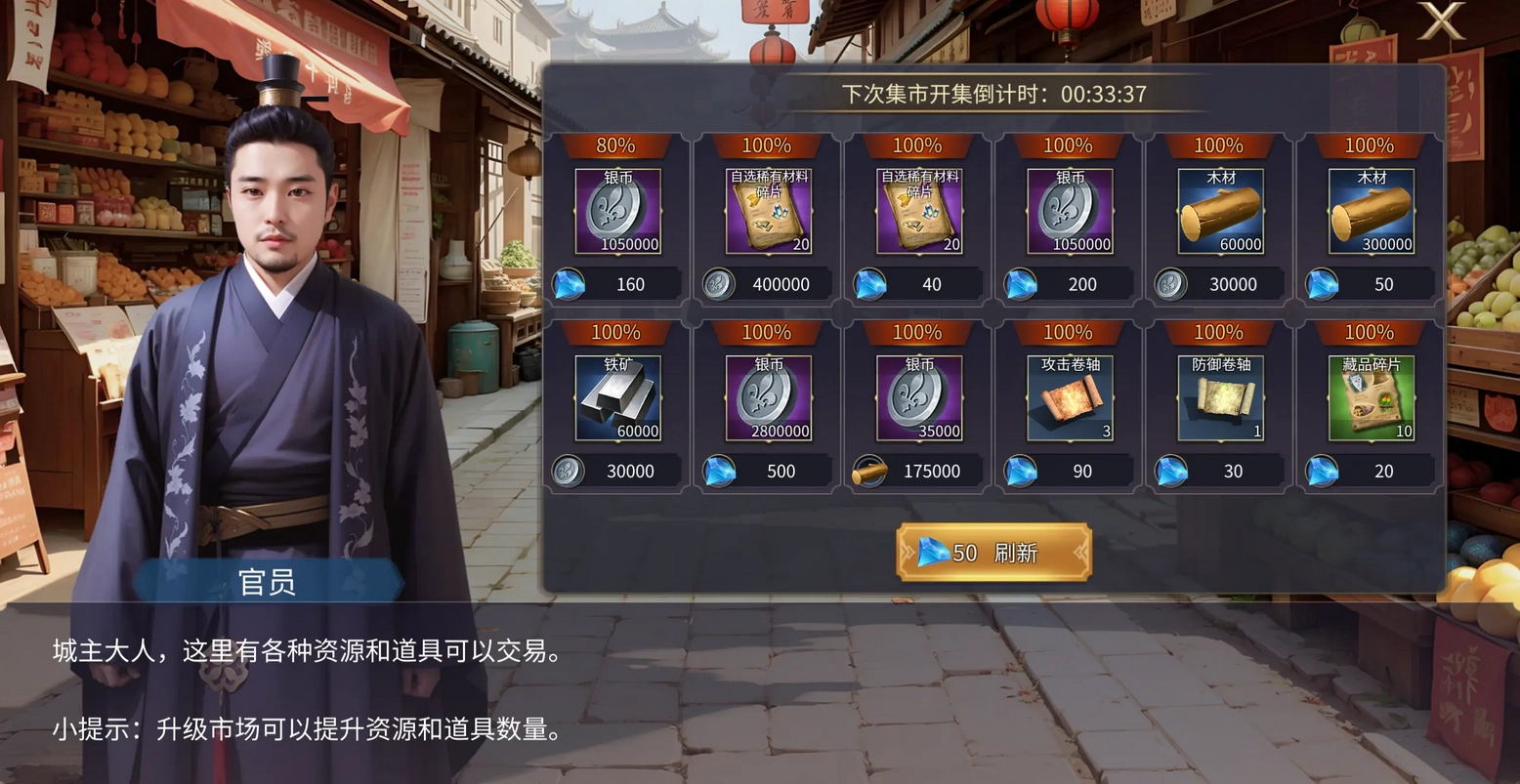 提升技能等级,核心资源是技能卡。土豪玩家对此毫无压力,毕竟随便刷些武将,就能攒下一堆技能卡(蓝绿品质的效果堪称无敌);而平民和小R玩家,除了偶尔用钻石刷武将好感度获取外,技能卡的获取主要靠三条途径:“商店适度兑换,集市经常逛逛,贸易免费白嫖”。