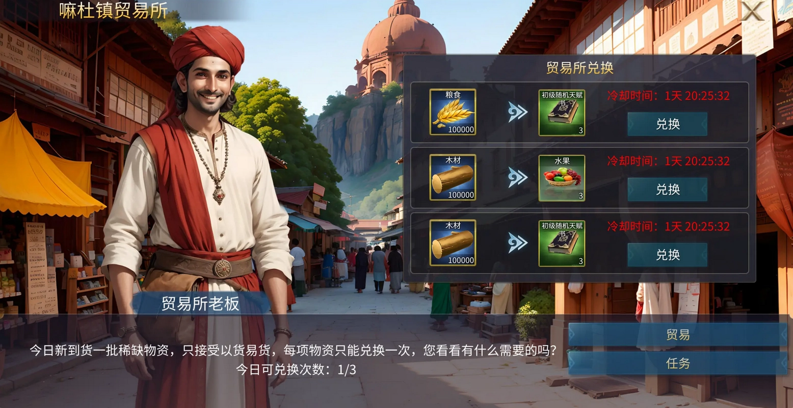 解锁任务后的贸易所,能够兑换高级水果,冷却时间为三天,每三天可兑换三种水果,总共九颗。