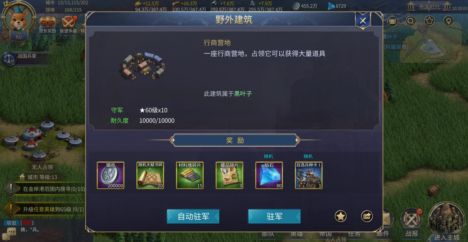 “积少以成多”,除了酒馆外,兵种卡还有其他获取途径。兑换商店每日会随机刷新两张兵种卡,碰到合适的务必获取;主城和分城的兵营升级完成后会得到一张随机兵种卡,因此城市建设需持续推进;兵种营地能提供固定种类的兵种卡,但最多只能领取四张;城镇守卫会提供随机兵种卡,奇迹守卫则提供固定兵种卡且无数量限制,有能力的话每天三次要确保参与;野外建筑(如古堡、行商营地、战争学园)有概率产出自选兵种卡,每天两次的机会绝对不能错过。