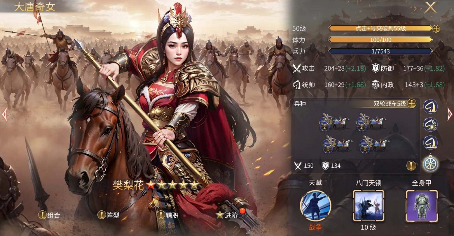 如图,在招到新英雄后,之前的节流策略开始显现成效,我们迅速用攒下的战车兵种卡把樊梨花的兵种等级提升到了5级。