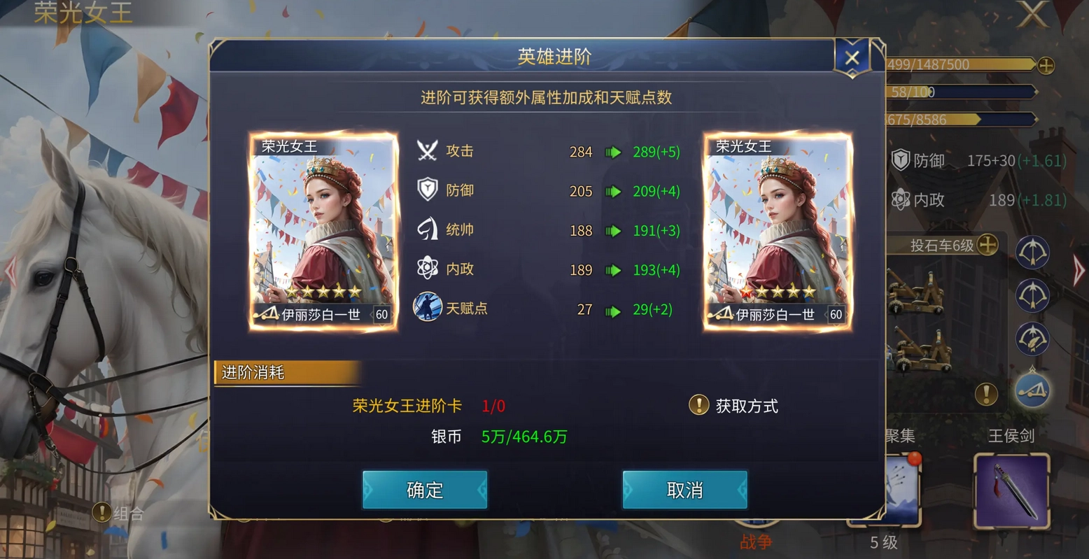 英雄等级达到60级时,能够佩戴两件不同位置的装备。以我目前所带的两件50级装备为例,它们总共为英雄增加了8点攻击、5点防御、5点统率,还为兵种带来了3点穿透属性,这样的加成效果也算是相当不错了。