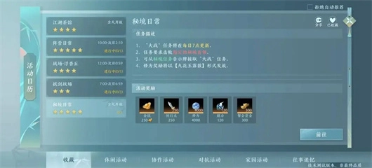 建议日常:现在游戏里不管你玩的是PVE、PVP还是PVX模式,有几项日常是一定要完成的:秘境日常、江湖茶馆和门派日常。