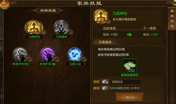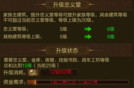 家族共有五座建筑,每座都能升级并提升对应属性。其中第一座是忠义堂,它的等级决定着家族等级,并且其他建筑的等级都不能超过忠义堂,必须等忠义堂升级后,其他建筑才能跟着升级。升级需要消耗家族资金,而且消耗很大,越往后升级花费越多。忠义堂的等级上限是20级,这是系统设定的要求。