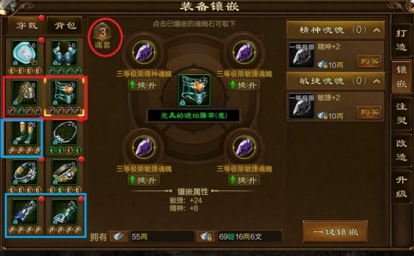 镶嵌魂魄石时需要留意,红框标注的头盔与腰带适合镶嵌精神、敏捷类魂魄石,前期最好每种各镶嵌4颗,这样就能让获得的石头得到均匀利用。蓝框内的鞋子以及两个护腕则应镶嵌抵抗类魂魄石,抵抗类包含抗冰冻、抗虚弱、抗破甲三种,每件装备只镶嵌一种类型,既不容易混乱,还能让所有抵抗魂魄石都得到均衡使用。