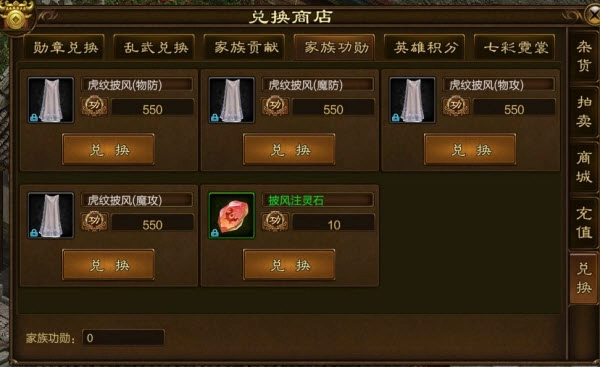 550功勋能兑换一个,初始就能增加1000战力,效果非常强力。前期第一周只要赢三场家族战,或者赢两场且自己是贡献最高的,就能换到——想抢最高贡献可以用战车拿宝石交宝石、占旗子这些方法。就算第一周没换到也不用急,慢慢攒功勋就行。兑换时一般选和自己攻击类型对应的披风,换好后用披风注灵石充灵,充满消耗白披风就能进阶成蓝色,后续也是逐步进阶。 需要注意的是,兑换出来开启时披风属性是随机的,建议换到属性好的再注灵。虎纹披风先看资质,分普通、良好、优秀、完美、无双五种;初期拿到资质不错的就能先培养,后期开出更好的,之前的披风还能当狗粮用。再看基础属性,有力量、智力、精神、敏捷、体质五种,随机出现3种——比如战士的话,智力属性没什么用,只加微量血量,尽量避开,其他职业同理。 还要看特殊属性和基础属性的对应:比如有的披风特殊属性是“人属性”,需要137点敏捷才能激活,但如果披风本身没有敏捷属性,这条就永远不会生效,等于浪费。所以得先确认特殊属性能被激活,再挑特殊属性种类——增加对应攻击20%、重击、神圣一击的是首选,追求单向减伤百分比的也可以考虑。 这么多条件同时满足不太现实,大家不用过分追求完美,重点看资质,其他属性差不多就行,十全十美的披风很难得。兑换出来属性不好的披风千万别分解,留着给披风进阶用,进阶时能派上用场。