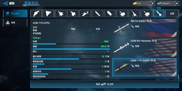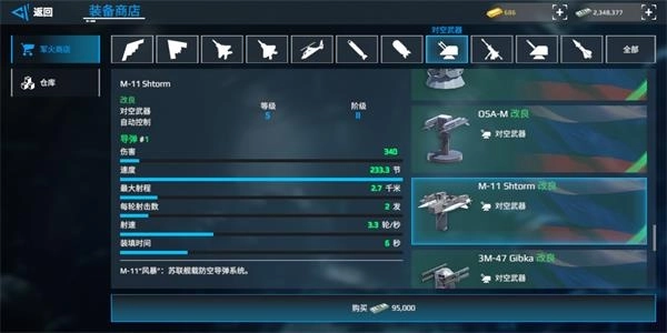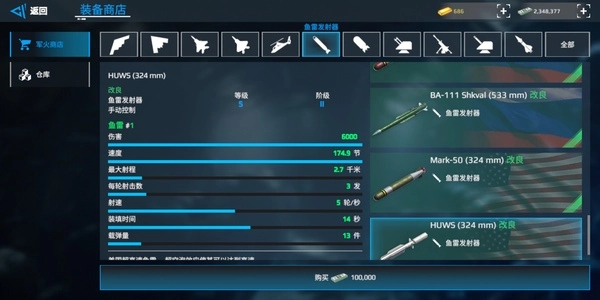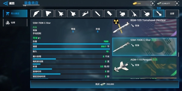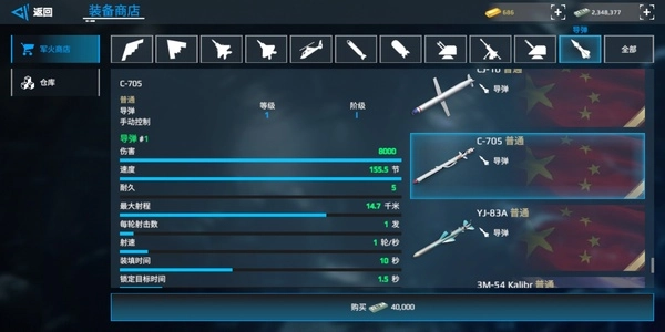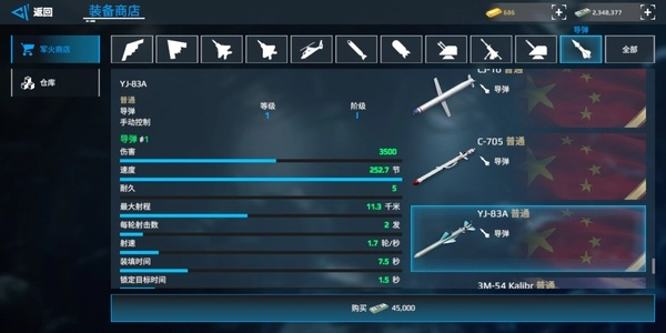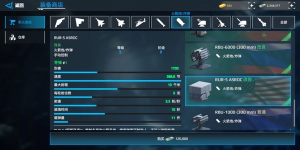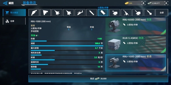 RBS:双发导弹,秒伤在全游戏里处于靠前位置,虽然飞行速度较慢,但凭借密集的发射方式能够实现突防。
