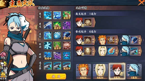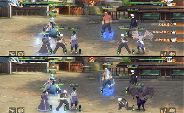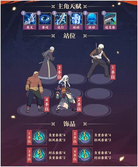 雷主的“雷遁忍者强化”能确保前三回合有高伤害输出;“武者的根性”可提升阵容中带刀忍者达鲁伊和三船的抗性,普攻选“凝神”,能恢复查克拉来保障队伍的灵活性。
