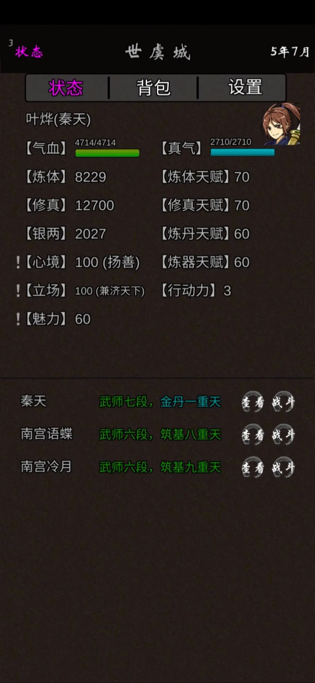 第二章的核心目标是尽快在秘境中通过SL(存档读档)刷出“不灭金身”功法,之后就专注于炼体方向;如果暂时没刷到,就先以修真为主,修炼时记得搭配+22的丹药辅助。秘境产出的两个功法都可以学习,但因为走的是“漂亮”路线,所以主要运用元青之术,修真仍是核心方向。炼体境界先提升到武师一阶或二阶即可。 秘境难度不低,需要频繁SL才能顺利通过,尤其是“赌”的环节(我第一局大概尝试了20次左右才成功)。等炼体到武师境界,就可以挑战村庄了;后续打镇子时,能获得的修为大概是2+3的数值。无论是打村庄还是镇子,选择“联合”选项更有利——打村庄时最好拉两个人帮忙分摊压力(一个也能凑活)。 善秘境遇到后先别急着通关,留着它计算好次数,刷到100点善值后再通关。过程中如果有了钱,记得及时购买装备并强化。最后挑战武秘境时,法系角色正常情况下很难直接打过,建议当天先打一次,回去调整状态后再回来继续挑战,这样更容易成功。 到了3年7月会有敌人找上门,其实可以提前在6月就主动打回去,而且那个村庄最好想办法占领回来。3年5月时,修为大概要达到武师6阶、筑基8阶的水平。打最终BOSS时也需要多次SL尝试,同样建议拉两个人帮忙(虽然不想这么说,但妹妹也可以算一个)。对了,一定要记得给装备升级,大概升到+7、+9、+6、+6的强化等级就差不多了。