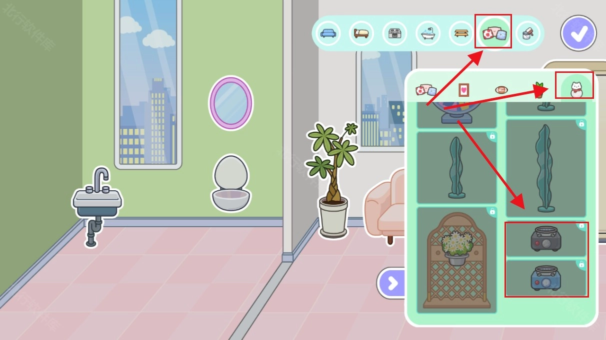 把人物安置到房间里后,就可以点击已购买的家具用品,对房子进行装修了。