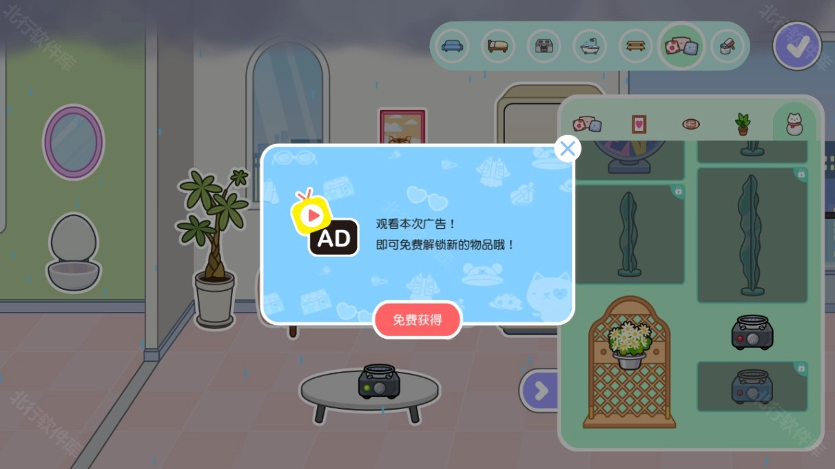 其中【黑色装置】对应下雨效果,【蓝色装置】对应下雪效果,只需观看一次广告即可解锁使用。