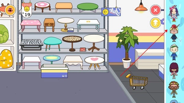 挑选好家具物品后,点击页面右上角的人物功能按钮,从中选择一位人物即可。