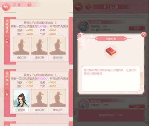 每一位知己最初都只是一面之缘,小主可以通过赠送知己道具,来增加知己的属性总和与亲密度。在皇家苑囿的积分兑换处,能用积分兑换提升知己情谊的道具。当知己的属性总和与亲密度达到要求,并且拥有对应情谊所需的道具时,就能提升知己的情谊啦。情谊等级越高,所需的属性总和与亲密度就越高,相应的道具数量则越少,最高级的情谊是一生挚爱,小主们要加油哦~