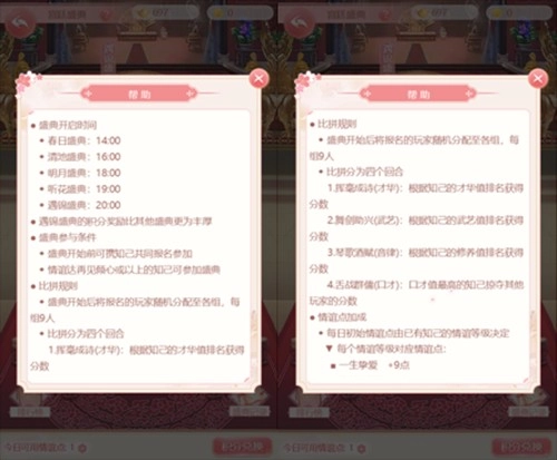 提升与知己的情谊,不仅能增强小主的势力,还能解锁乾清宫,让小主有机会参与宫廷盛典。每当有一位知己的情谊提升至“再见倾心”阶段,小主就能额外获得一次参与盛典的机会,最多可参与5场不同时间开启的盛典。在盛典开启前,小主可派遣知己参与,并通过分配情谊点临时提升知己的属性。每场盛典设有4个比拼回合,依次围绕才华、武艺、音律、口才四项属性展开——才华、武艺、音律回合可直接积累分数,口才回合则能掠夺其他玩家的分数!最终将以总分数进行排名,并根据排名发放相应奖励。