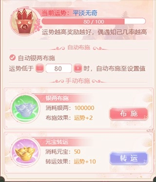 运势越高,遇到知己的几率就越大。要是想更快地带走所有知己,你可以点击左下角的【运势签】来提升当前运势哦。布施时用银两能+2点运势,用元宝转运则能+10点运势呢~另外,在布施页面还能设置【自动布施】,勾选后每次游玩结束都会自动把运势补到设定值。运势每15分钟恢复1点,但最多只能恢复到90点。