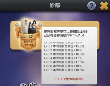 每天开展经典翻拍项目(具体内容后文会详细说明)有助于提升影都声望,玩家可依据自身所处的档位来解锁对应的影都声望等级。当前版本中,最高档位为世界10档,对应的声望等级是Lv40。若玩家在上一周成功完成了声望的累计任务,那么下一周所有影片的拍摄(没错,就是所有拍摄的影片都能享受,相当给力!)所获得的总票房,都可以得到对应声望等级所介绍的百分比加成。