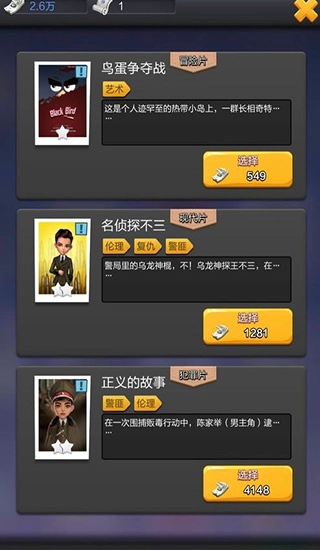 从经典港片到好莱坞大片,看过了那么多荧幕经典,你想亲自重拍哪一部呢?游戏拥有海量剧本,爱情、动作、古装、喜剧等各种类型一应俱全,经典大片任你挑选,热映新片剧本不间断上线,想拍什么电影,统统满足你。