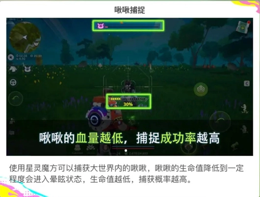 当啾啾或坐骑的血量下降并陷入眩晕状态时,我们可以把武器切换成星灵魔方,然后对准它。此时屏幕上会显示成功捕捉的概率,我们只需要瞄准并投掷魔方就行。