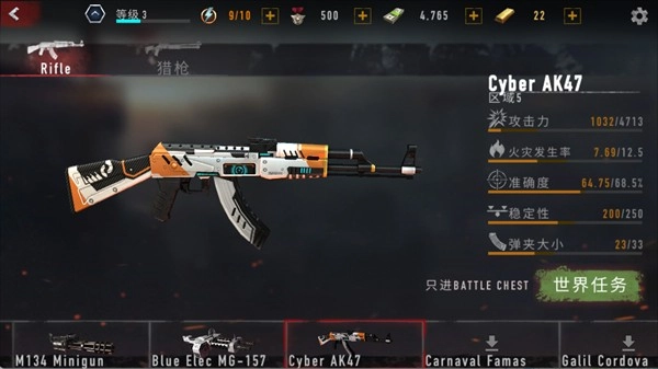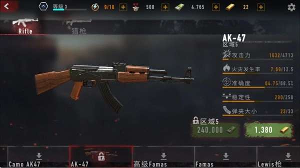 攻击力数值为4713,火灾发生率是12.5,准确度达到68.5%,稳定性为250,弹夹容量为33,解锁条件为240000现金与1380金条。