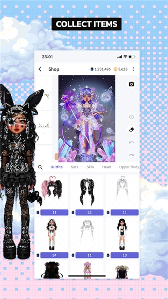 点击“shop”选项,便能浏览到各式各样搭配好的精美服装,这些服装各自标注着不同的价格。