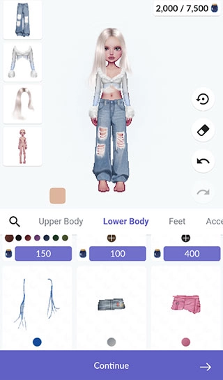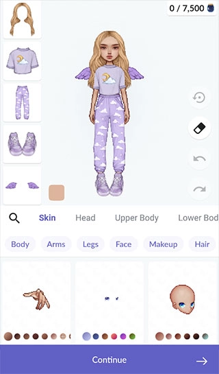 你还能给虚拟形象挑选各种风格的包包,装饰好之后点击底部的“continue”箭头就行啦!