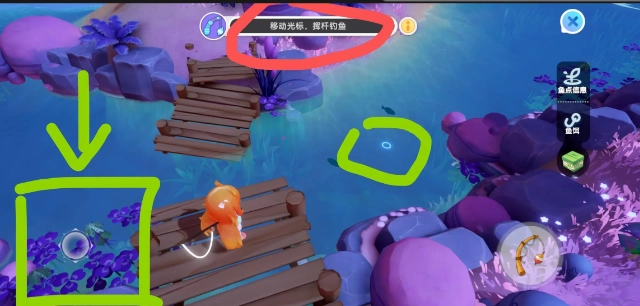 第二步:借助左侧方向键(绿圈标注处)将光标(右侧绿圈所指)移动到目标鱼的前方位置,注意保持合适距离,避免惊扰到鱼。即便不小心惊到鱼也没关系,过一会儿还会有其他鱼咬钩的。
