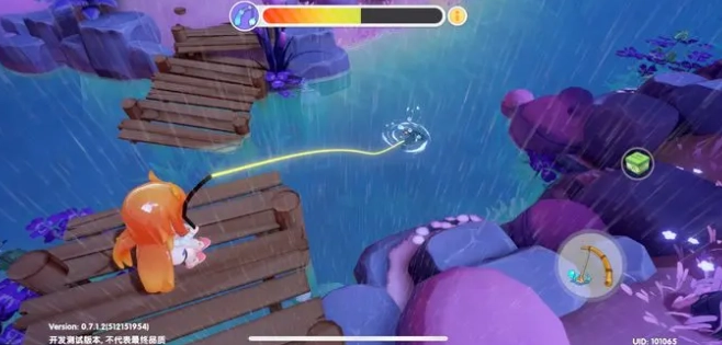 第五步:鱼挣扎片刻后会进入稳定状态,这时要快速长按拉线。留意顶部的进度条,一旦进度条进入黄色区域,就切换为间断点击的方式,保证鱼既不会游远,也不会因过度拉拽而使进度条进入红线区域,避免鱼线断裂。