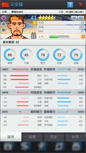 再聊聊小前锋的身体素质要求吧,通常对速度的要求不用特别快,但最好不要低于60;力量方面,最好也别低于55。