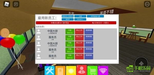 之后我们就能雇员工负责餐饮和服务,自己当甩手掌柜?其实不然,我们还得时刻留意收取客人的消费现金——要是没及时收款,那张桌子可不会有下一桌客人来坐哦~在餐厅盈利的过程中,我们可以不断扩大店面、装修升级,让店铺更吸引顾客,成为最热闹的餐厅!员工雇佣方面:当餐厅发展到一定规模时,就需要聘请专业员工了,像厨师、服务员、世界星级大厨、咖啡师和得来速员工都在其中。