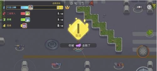 看到地图上的武器了吗?走过去,然后拿起它。攻击的按键就是右侧最大的那个,看到敌人就按这个键,把他的血条打空,你就成功击杀了,还能获得一次积分。